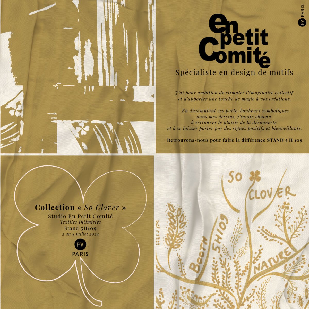 J’ai le plaisir de vous inviter à découvrir -entre autres- ma collection de design de motifs « So Clover » lors du salon Première Vision Designs, qui se tiendra du 2 au 4 juillet 2024.